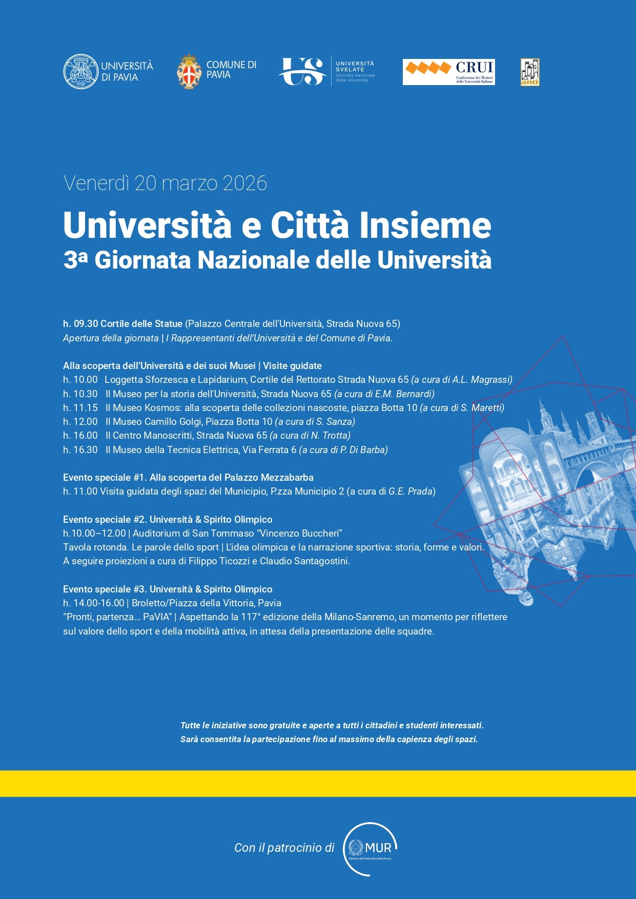 Le iniziative sono gratuite e aperte a tutti nel limite consentito dagli spazi e dalle norme sulla sicurezza. L’iniziativa è organizzata in collaborazione con il Comune di Pavia e istituita dalla CRUI – Conferenza dei Rettori delle Università Italiane per la prima volta in data 20 marzo 2024, in coincidenza con la Giornata Internazionale della Felicità e all’interno della Settimana della Minerva, un periodo dedicato alla celebrazione del sapere e dell’istruzione. Fin dal suo concepimento la Giornata Nazionale delle Università ha avuto come finalità quella di mostrare il ruolo propulsivo che le Università rivestono nello sviluppo del Paese e nella promozione della coesione sociale. Quest’anno verrà dedicato un focus particolare sul rapporto Università, Sport e Territorio con un appuntamento sullo Spirito Olimpico ieri e oggi e con l’evento speciale “Pronti, partenza… PaVIA” | Aspettando la 117ᵃ edizione della Milano-Sanremo”.