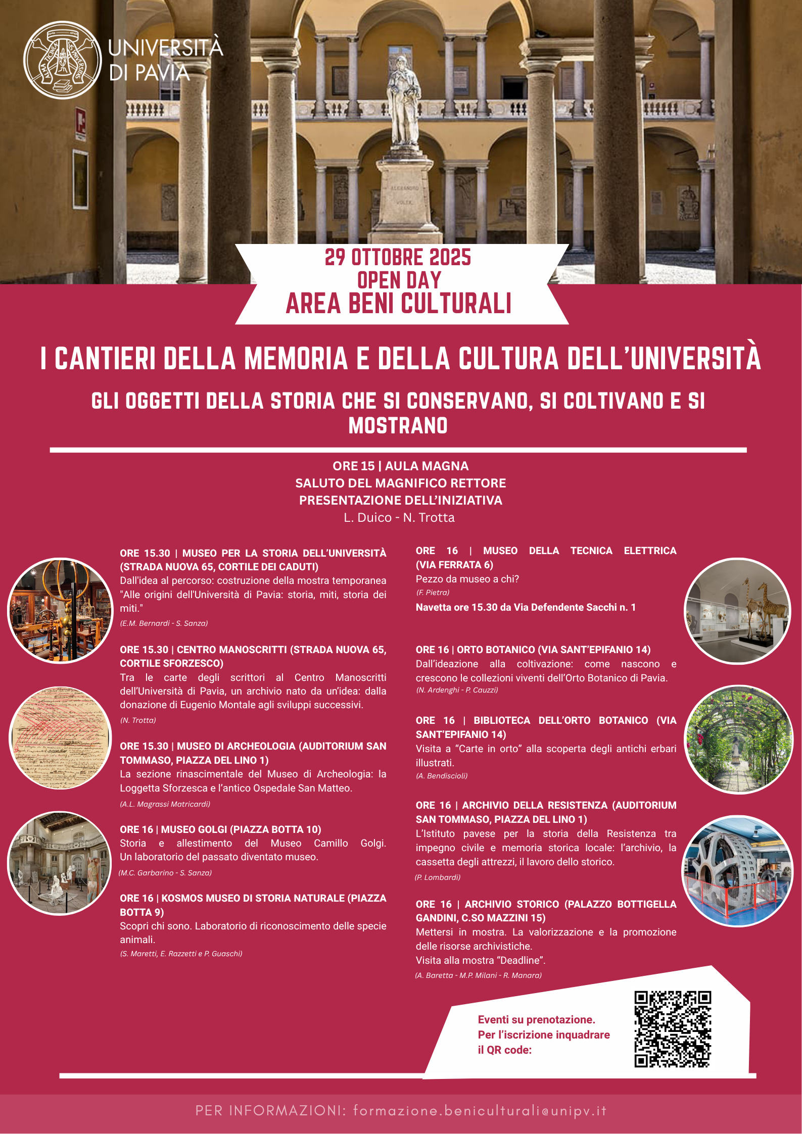 Ore 15 nell’AULA MAGNA dell’Università di Pavia, Piazza Leonardo Da Vinci n. 12, il Magnifico Rettore Alessandro Reali, il Dirigente Lorenzo Duico e Nicoletta Trotta presentano l’iniziativa e propongono la proiezione di un video sull’Area Beni Culturali dell’Ateneo.