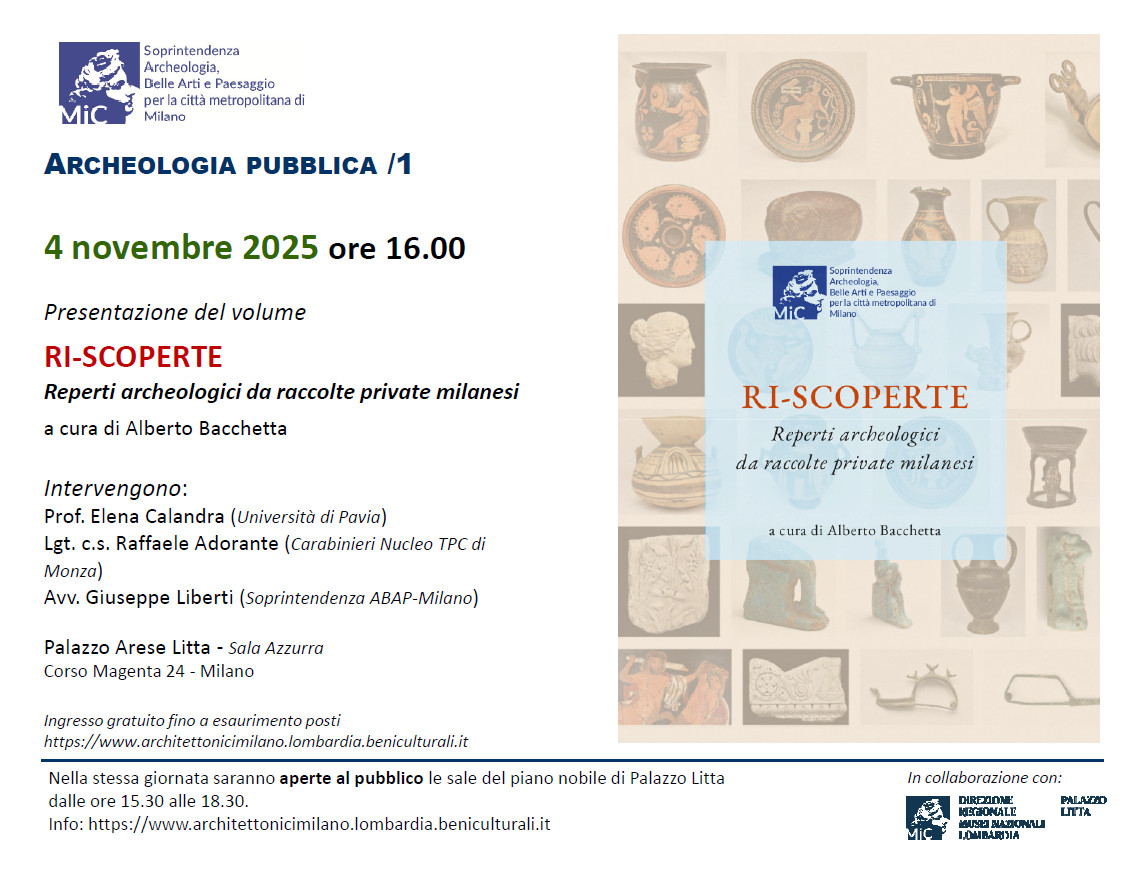 Martedì 4 novembre 2025, alle ore 16.00 si terrà nella Sala Azzurra di Palazzo Litta a Milano la presentazione del volume “Ri-scoperte. Reperti archeologici da raccolte private milanesi” curato da Alberto Bacchetta, funzionario archeologo della Soprintendenza Archeologia, Belle Arti e Paesaggio per la città metropolitana di Milano.